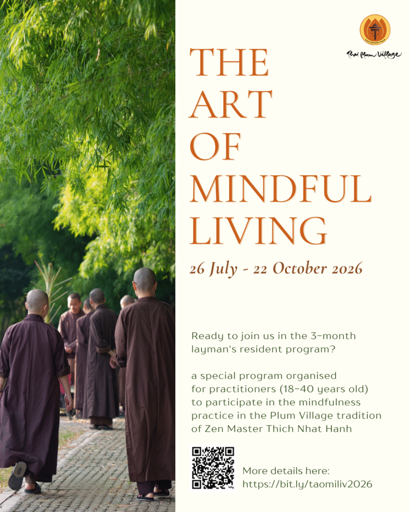 “The Art of Mindful Living” is a special program organised for lay practitioners (18-40 years old) to practice mindfulness in the Plum Village tradition of Zen master Thich Nhat Hanh. This program provides you with an opportunity to practice together with the monastic sangha for the whole three months during the rain retreat, from July 26 to October 22, 2026.